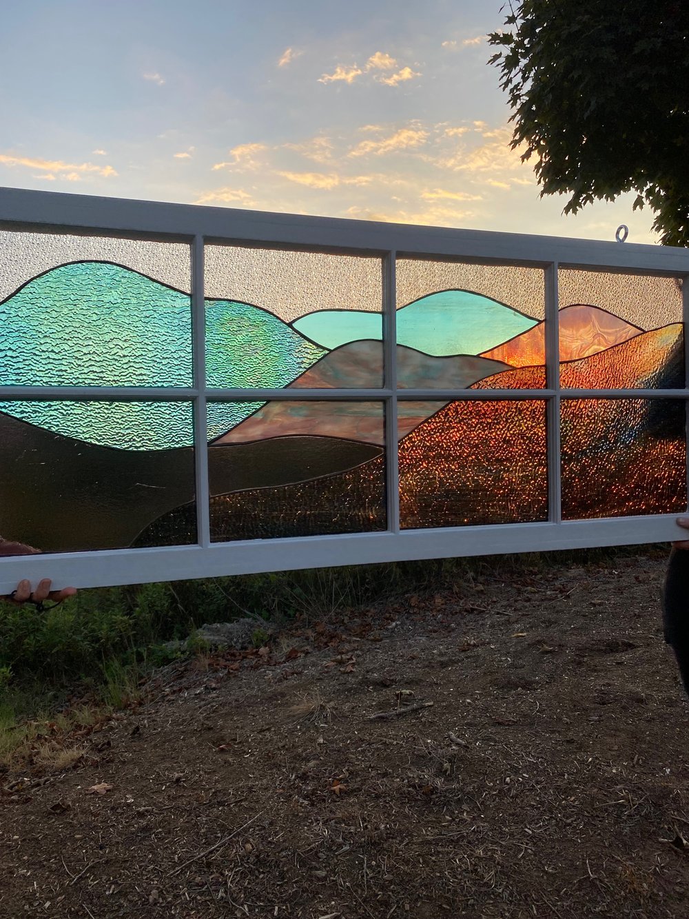 Mama Mountain was designed to fit in a salvaged french door that we restored from top to bottom. Inspired by the blue ridge mountains of North Carolina this piece is a stunner. It measures approximately 2x6ft and is intended to be hung as a privacy panel on a porch. Two eyebolts are attached for easy hanging.